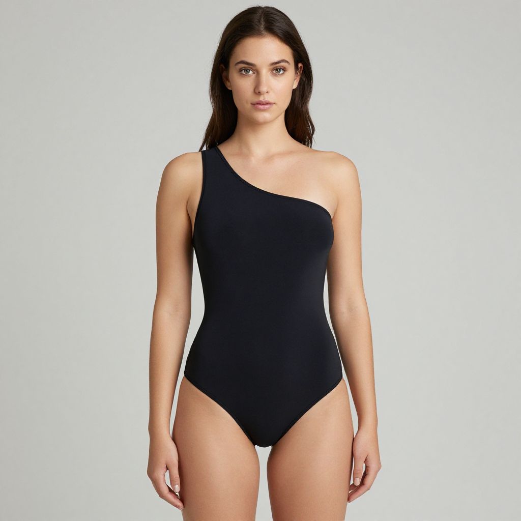 "Woman, minimalist swimwear, black one-piece swimsuit, high-cut leg, asymmetrical neckline, single shoulder strap, clean lines, subtle sheen, plain background.. Sexy. Pretty face and beаutiful eyes. Big breasts."