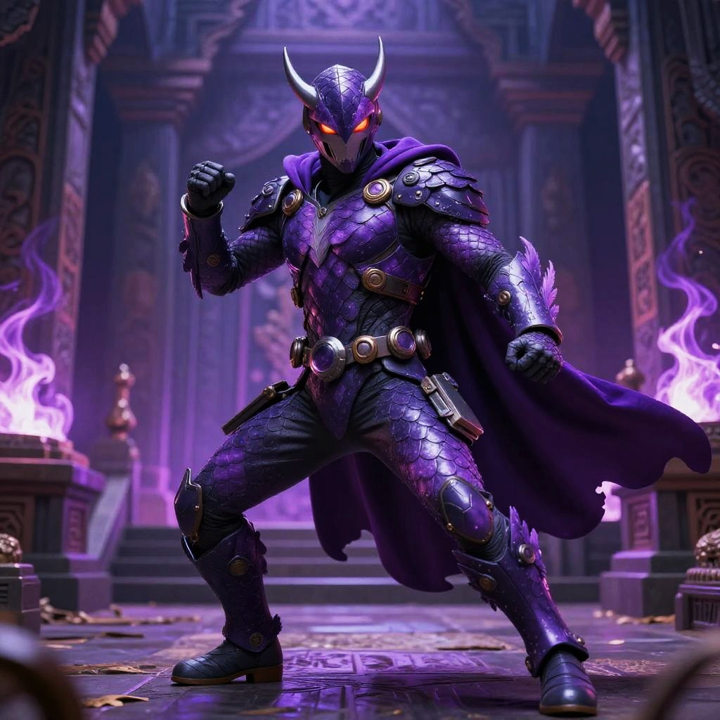 Illustration of a purple superhero costume inspired by futuristic samurai armor, combining layered metallic plates with sleek fabric sections, standing confidently on a cliff with stormy clouds and lightning in the background, conveying authority and bravery.