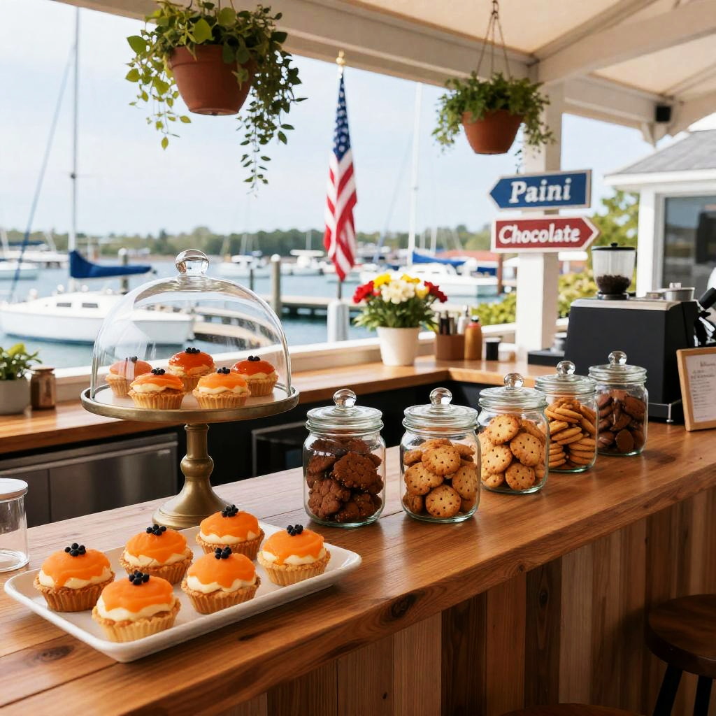 Photograph of a marina café. Wooden counter with orange pastries, jars of cookies, and a glass dome. Background includes sailboats, American flag, and signs pointing to "Paini" and "Chocolate." Hanging plants and flowers decorate the area. Bright daylight.