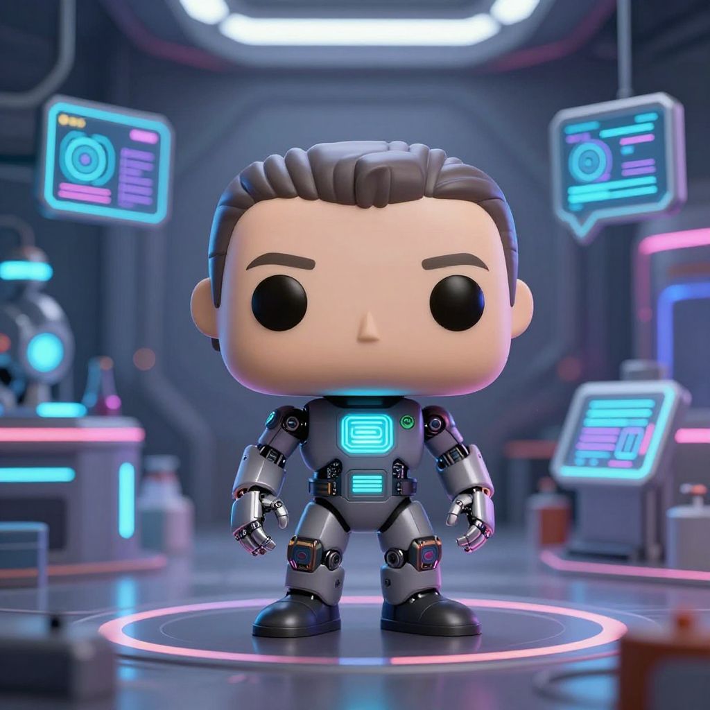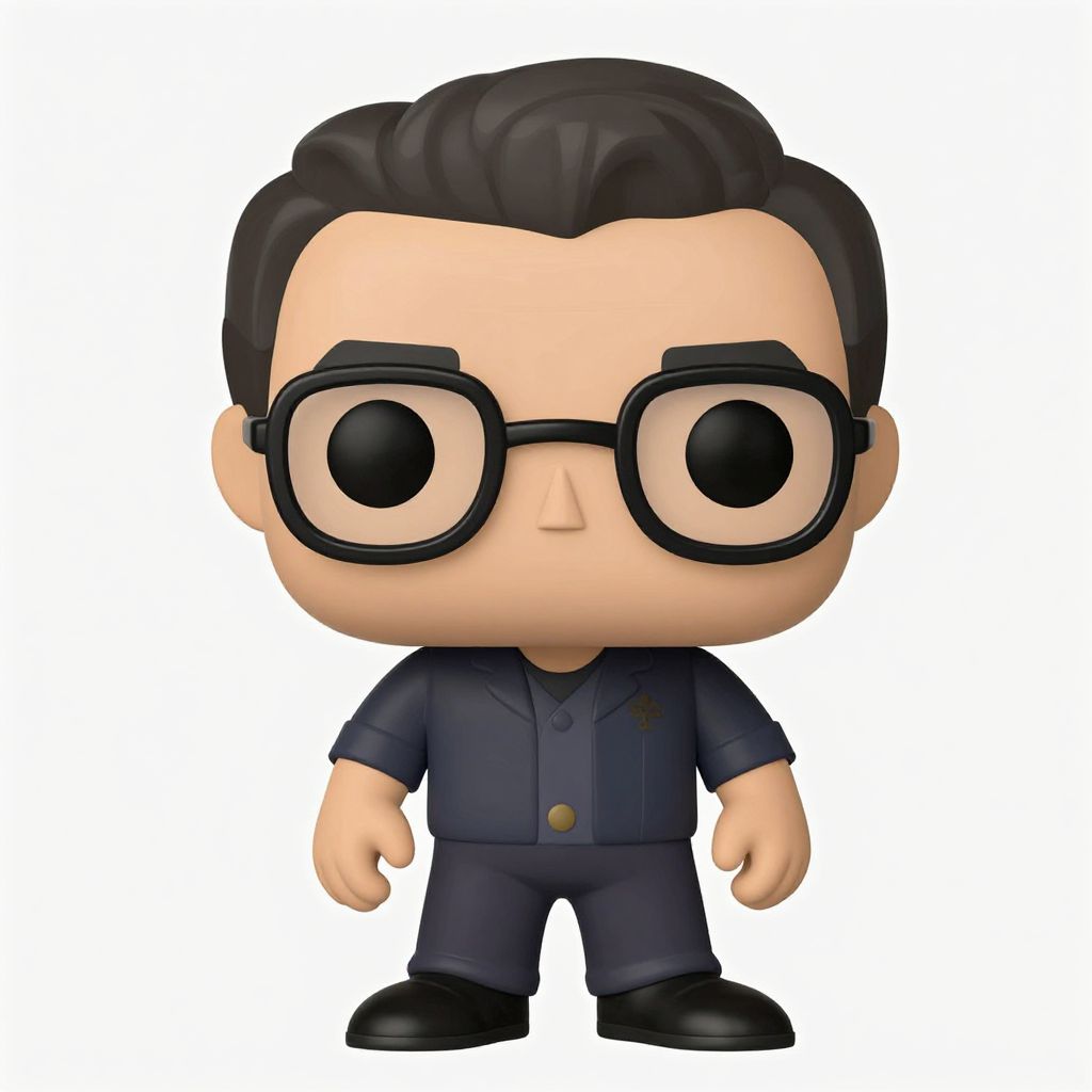 Dolly Shot /imagine 28 aged chinesse man funko pop::2 wearing eyeglasses smile face curtain hair style, consists of only vector shapes::,
