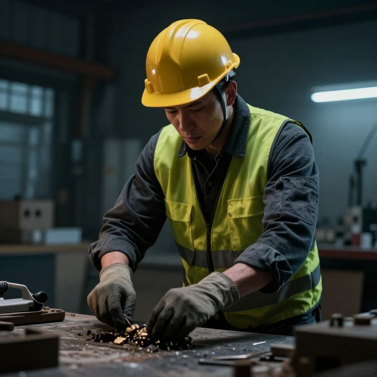 Photograph of a male construction worker in a dimly lit workshop. He wears a yellow hard hat, neon yellow safety vest, and gray gloves, concentrating on grinding metal pieces on a workbench. His dark gray shirt contrasts with the bright vest. The background is blurry, featuring industrial elements like shelves and a fluorescent light. Sparks fly from the grinding tool, illuminating his focused expression. The workshop has a gritty, industrial atmosphere with metal textures and dark, shadowy corners.