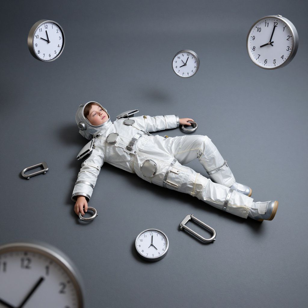 Photograph of a man in a white spacesuit lying on a dark gray floor, surrounded by six clocks, each showing different times.