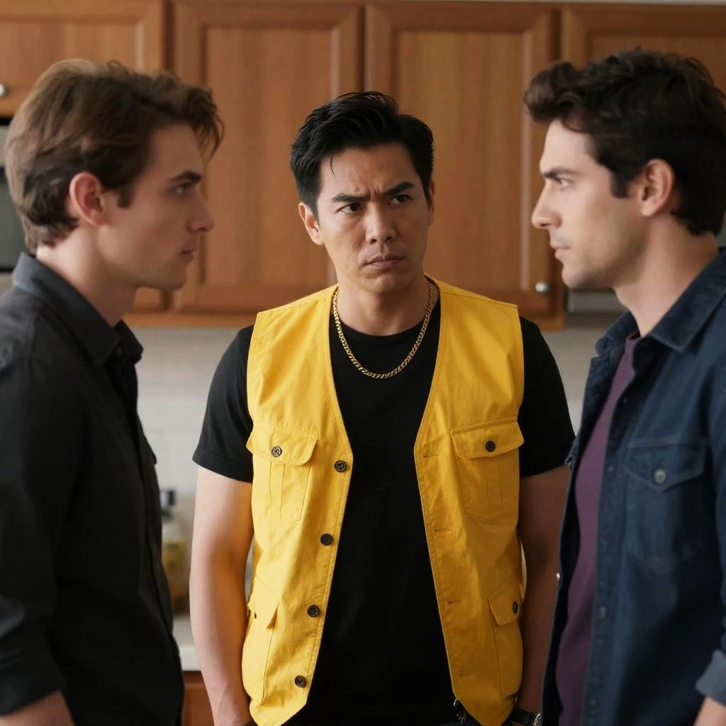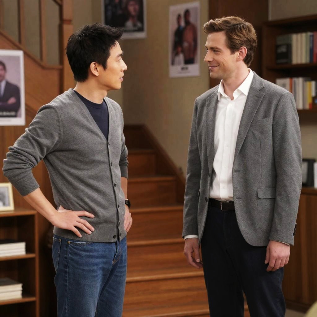 Photograph of two men in a dimly lit room, facing each other in profile. Man on left has light brown hair, wearing a dark shirt with mesh ure. Man on right has short dark hair, wearing a blue suit with white shirt. Light from right casts shadows on their faces. Background includes blurred shelves and equipment. Intense eye contact.