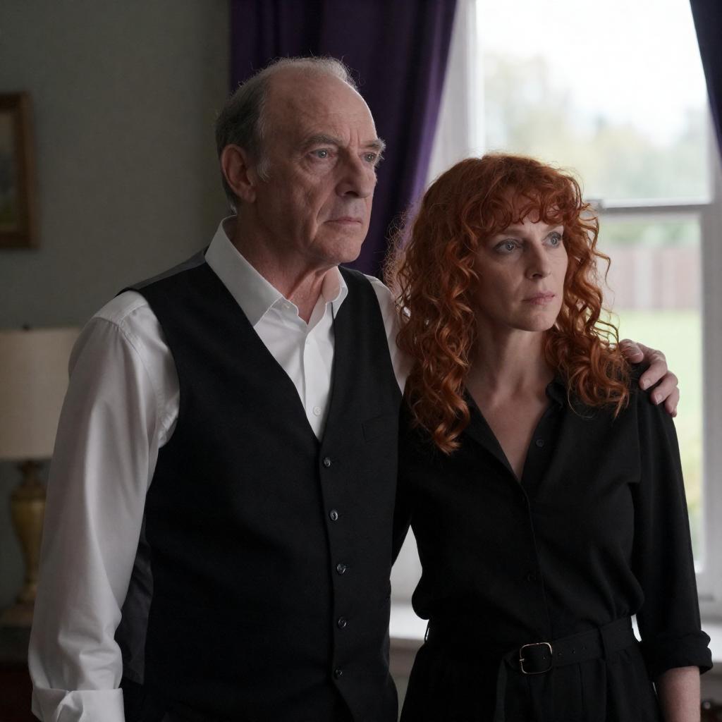 Photograph of an older man and a woman standing close together in a dimly lit room. The man has receding hair, pale skin, and wears a black vest over a white shirt. The woman has curly red hair, pale skin, and wears a black blouse. Both look to the right. A window with purple curtains is behind them, showing a bright outdoor scene with greenery and a fence. The woman's arm is around the man's back.