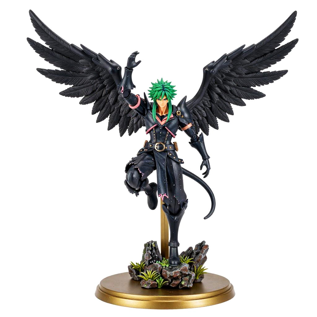 Photograph of a detailed action figure with a green-haired, anime-style character standing on a golden base. The character has large, black, feathered wings spread wide, and wears a dark, form-fitting outfit with red and white accents, a belt, and boots. They hold a small, black, bag-like accessory in their right hand. The character's face is expressive with a confident smile, and their hair is spiky. The base features small, rocky textures with green moss-like elements. The figure's pose is dynamic, with one leg slightly raised, exuding a sense of motion and power.