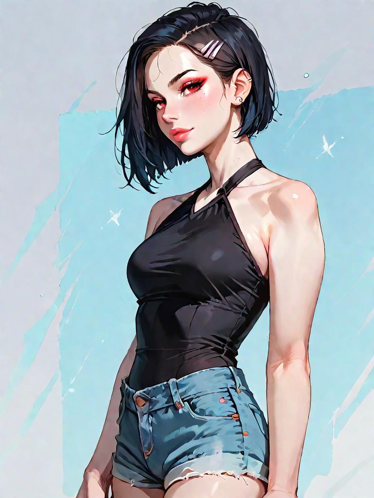 Anime Girl in Black Halter Neck Swimsuit and Distressed Denim Shorts