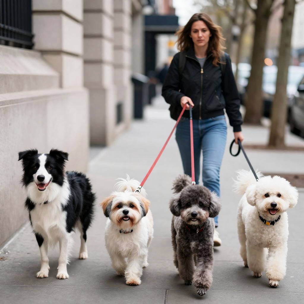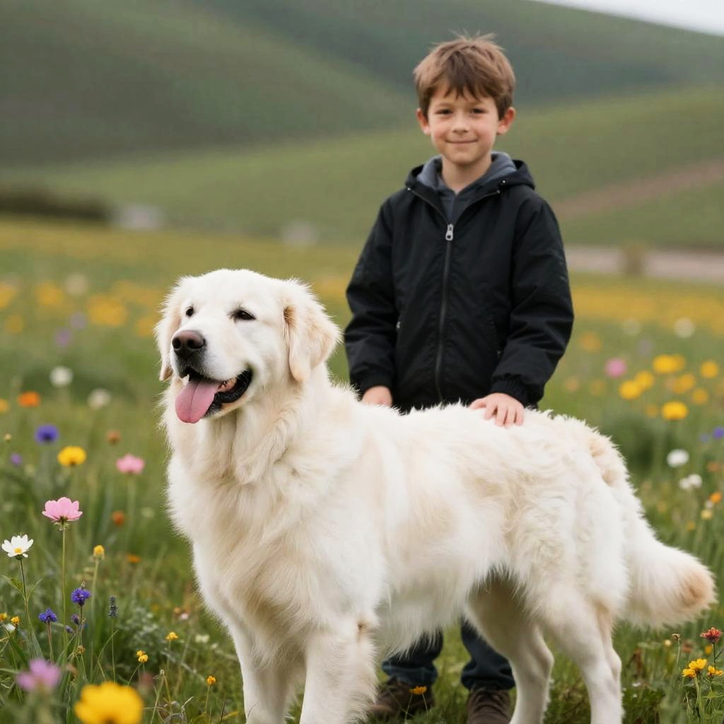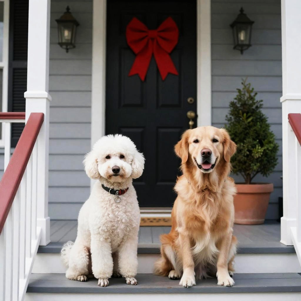Photograph of two dogs on green grass. Yellow Labrador sits on left, white poodle with fluffy coat stands on right. Labrador looks to left, poodle gazes forward. Sunlight casts shadows. Background includes grass and blurred foliage.