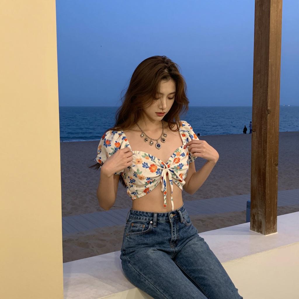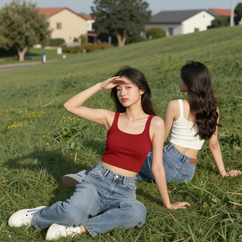 Photograph of a young woman standing outdoors at sunset. She has long, straight brown hair, wears a black bikini top with strappy details, black loose pants, and black and white sneakers. She stands with her hands in her pants pockets, looking to the side. The background includes dry grass, shrubs, and a partly cloudy sky with a visible moon.