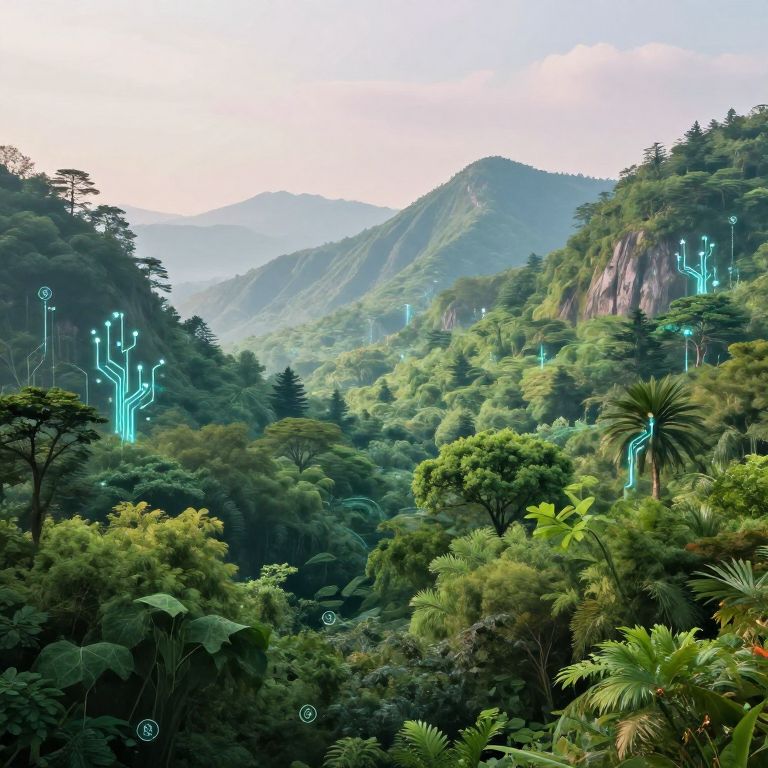 Photograph of a lush, green mountainous forest scene with vibrant, neon blue, circuit-like patterns glowing on trees and cliffs. The dense forest includes various trees, including palm-like plants in the foreground. In the background, misty mountain peaks are visible under a partly cloudy sky. The glowing patterns are digital overlays, contrasting the natural landscape. The image combines realistic natural elements with futuristic, cybernetic aesthetics, creating a surreal, sci-fi-inspired scene.