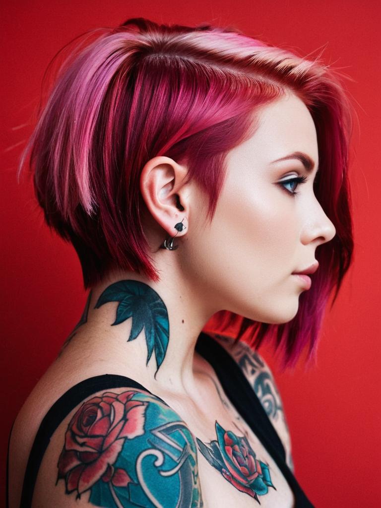 1girl, solo, tattoo, pink hair, asymmetrical hair, upper body, piercing, profile, from side, red hair, bare shoulders, facial tattoo, blue eyes, red background, nose, parted lips, neck tattoo, lips, short hair, ear piercing, undercut, looking at viewer, eyebrow piercing, shoulder tattoo, sidecut