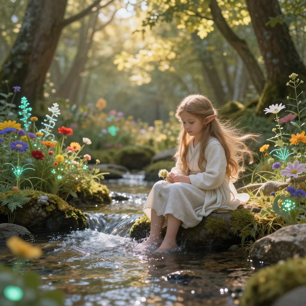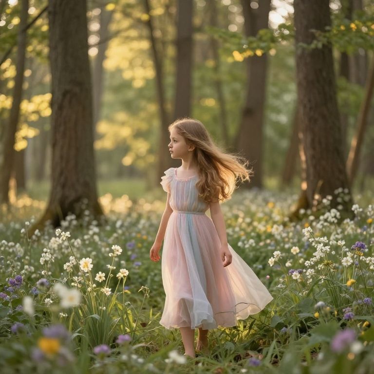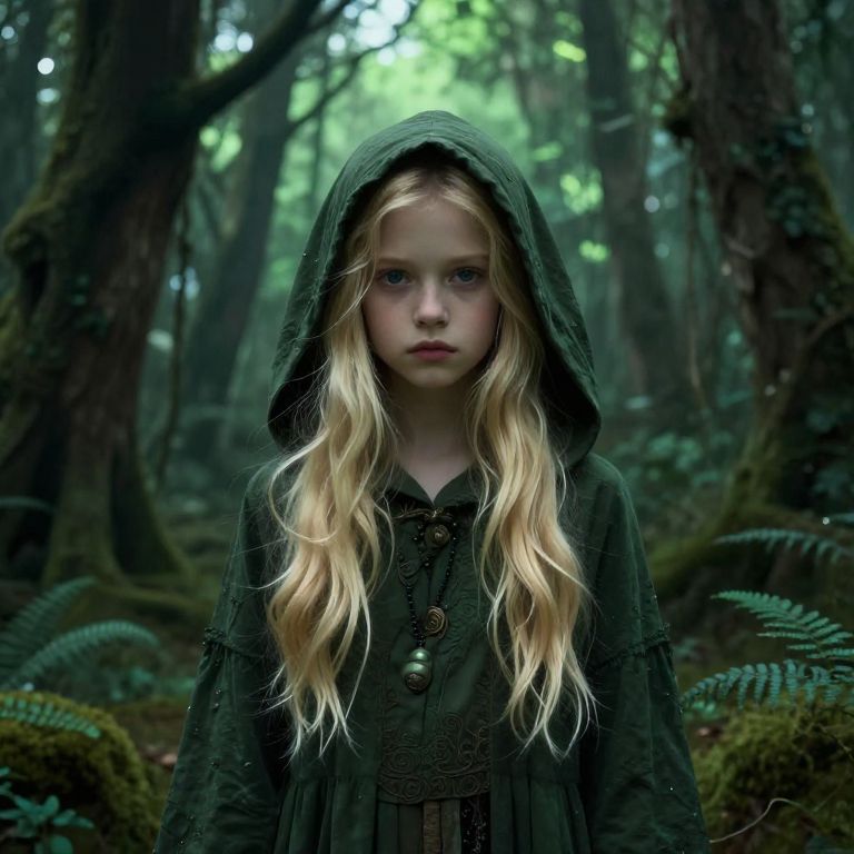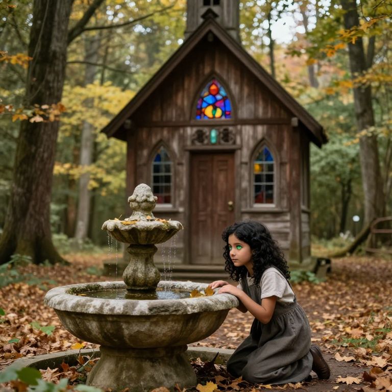 A hidden holy place deep in a forest glade, where a weathered wooden chapel with stained-glass windows overlooks a small clearing. A young girl with curly black hair and bright green eyes kneels beside a stone fountain, her face peaceful and focused. Leaves gently fall around her as soft autumn light filters through the trees above.