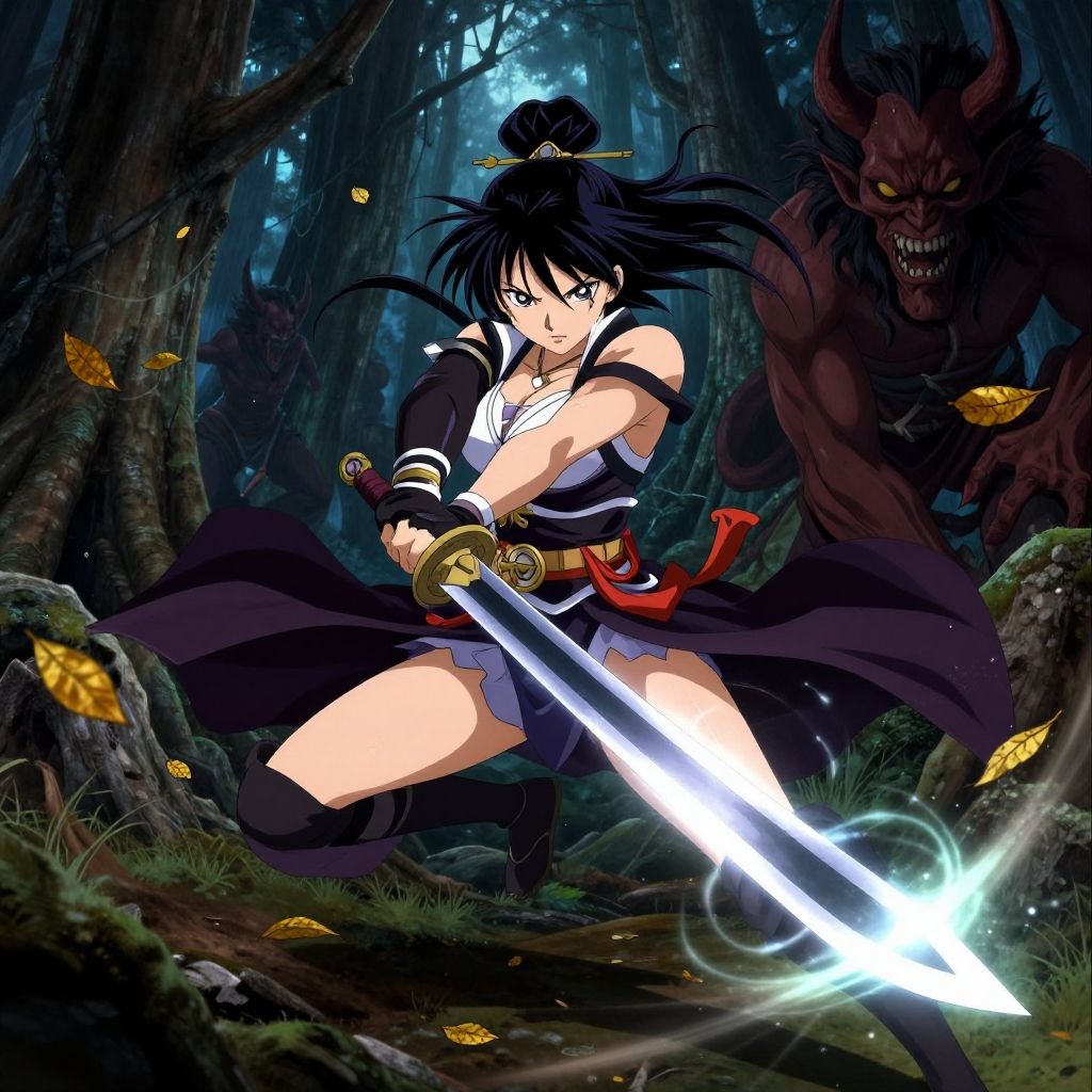 Anime sword woman mid-battle with demons in an ancient forest, swirling leaves, magical aura around the blade, intricate outfit, energetic composition, vivid and dark tones