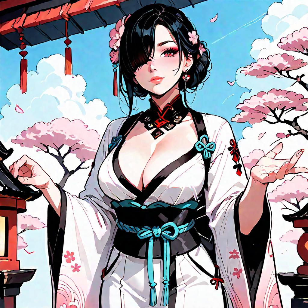 Score_9, score_8_up, source_anime, 1girl, solo, hair over one eye, black tiara, hair flower, pink flower, cleavage, red and white kimono, black sash, wide sleeves, large breasts, japanese architecture, blue sky, smile, looking to the side
