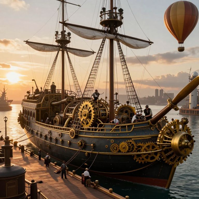 Photograph of a vintage steampunk-style ship with intricate gears, sailboats, and a hot air balloon at sunset, docked by a city