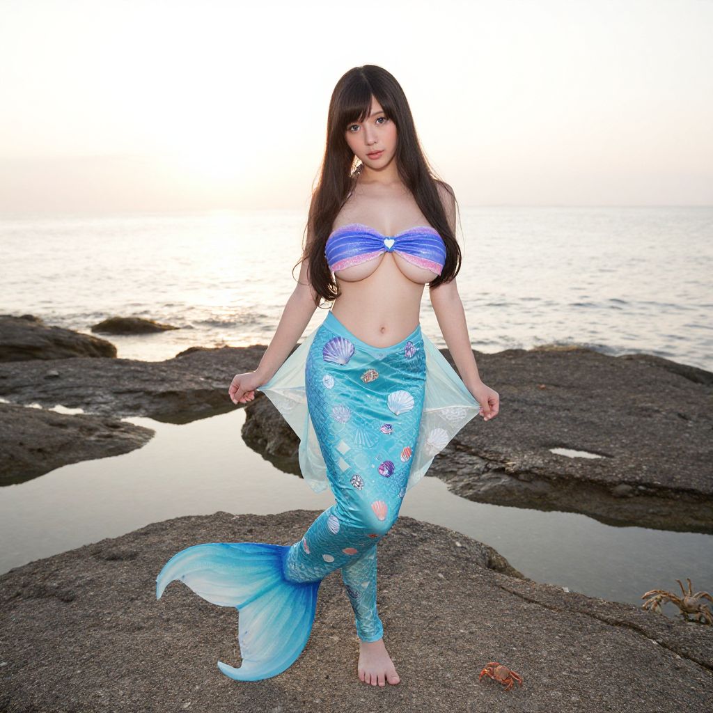 Photorealistic image of a woman in an Ariel Little Mermaid costume, standing confidently on a rocky shoreline at dawn, the sun casting golden light over the water. She has a delicate, youthful face with soft features, rosy cheeks, and large bright eyes. Her dress is fully detailed with blue fabric and seashell patterns, and her tail is gently waving in the breeze, surrounded by tide pools and small crabs.. The woman has big tits and cute face