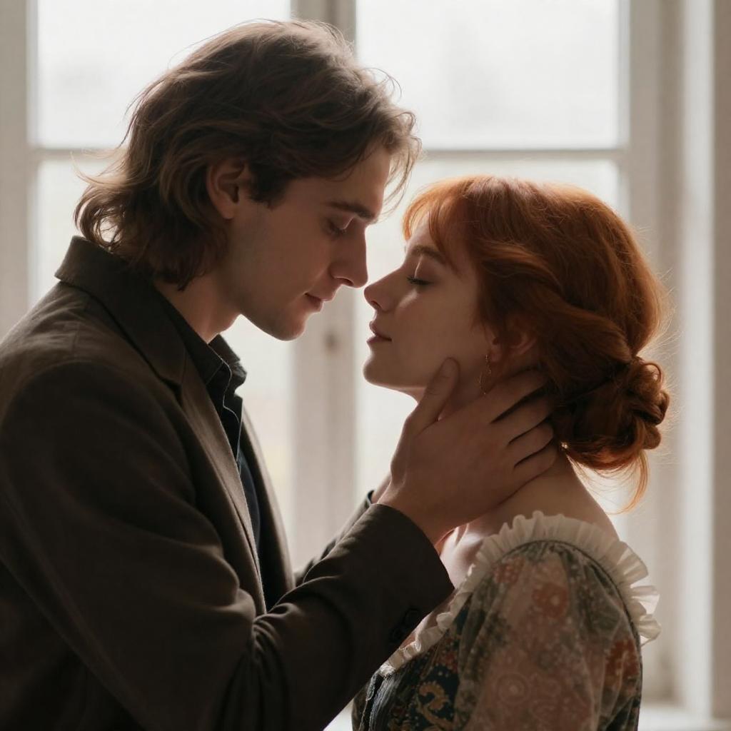 Photograph of a romantic scene: a man with long brown hair in a dark jacket gently holds the face of a woman with fair skin and red hair, styled in an elaborate updo. She wears a patterned dress with a white ruffle. They are close, eyes closed, in an intimate moment, with a bright window in the background.