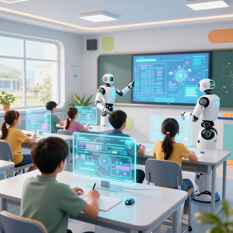 Instructive futuristic classroom with holographic displays and robots assisting students, sleek modern design, young diverse learners focusing intently on interactive lessons, bright and colorful environment with a touch of sci-fi, highly detailed digital painting
