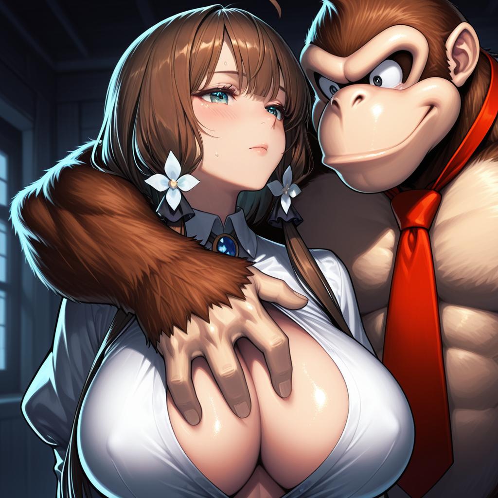 A detailed anime-style digital illustration featuring Donkey Kong, a large muscular anthropomorphic ape wearing a red necktie, standing close to a young woman with brown hair and large blue eyes. The woman has long brown hair adorned with white flower hairpins and wears a white blouse. The setting is indoors with dim lighting.