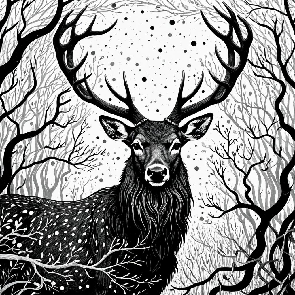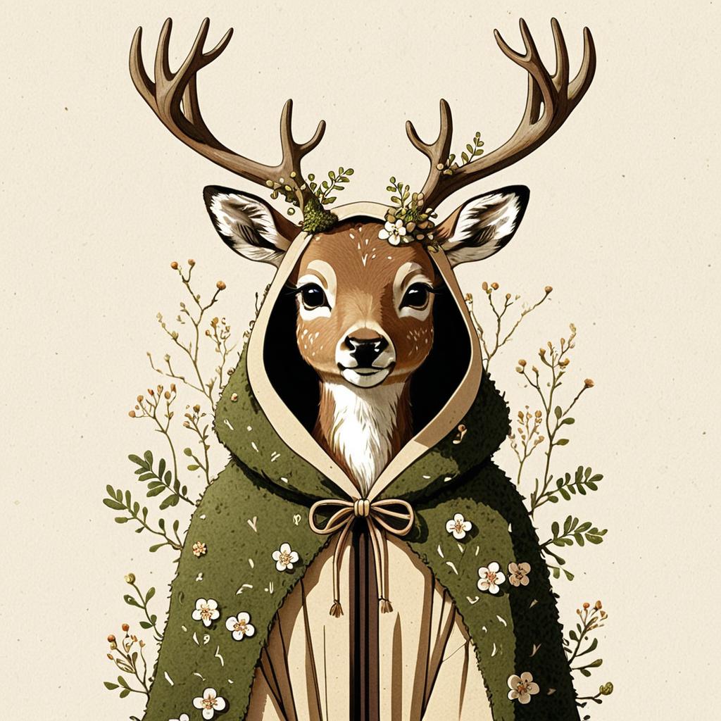 A whimsical Japanese cartoon-style illustration of a deer with moss-covered antlers. Set on a soft beige, with earth tone leafy cloak and a body adorned with tiny flowers and vines. Playful and charming aesthetic.