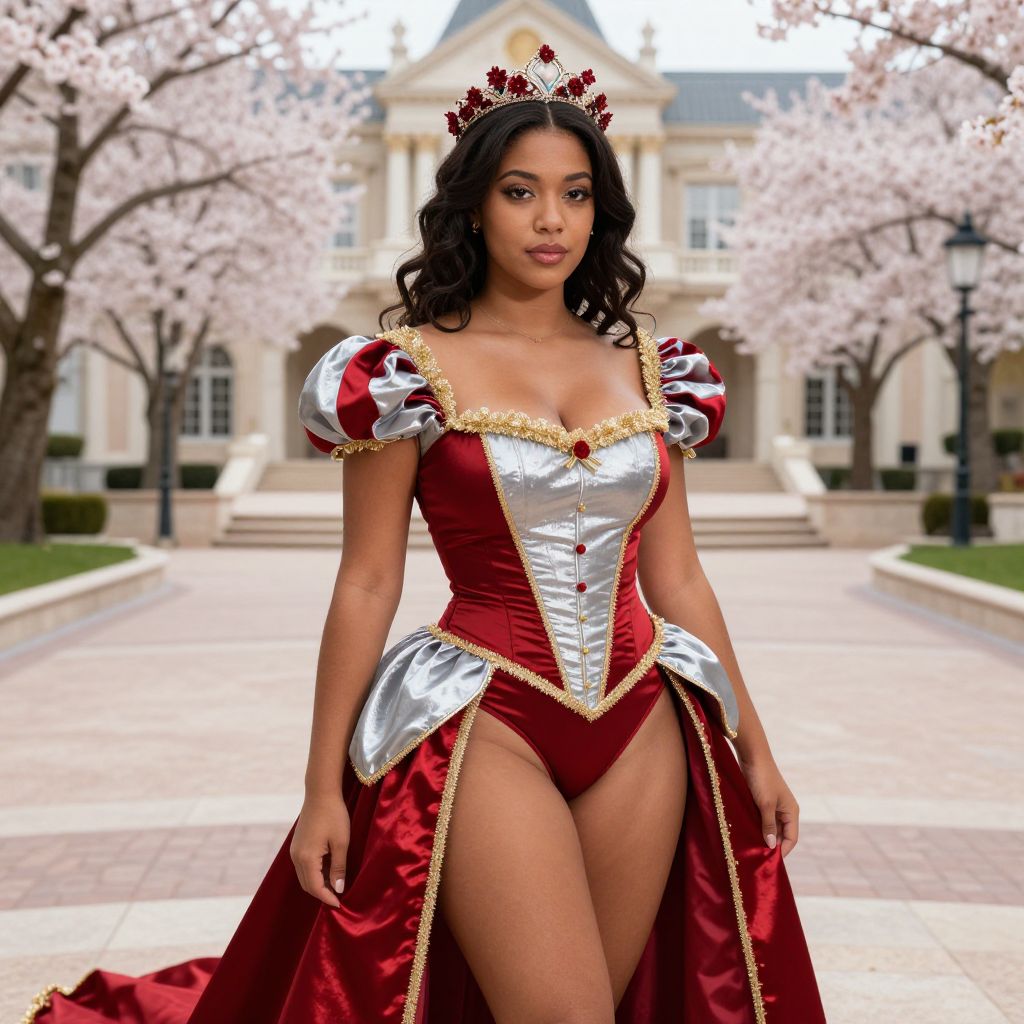 A high-resolution photo of a confident young woman in her mid-twenties with warm brown skin, wavy dark hair, and a calm, determined expression, dressed in a beautifully crafted Cinderella costume with a regal crimson and silver bodysuit, full train, and a crown of floral vines, standing in front of a grand palace courtyard with cherry blossom trees in bloom, capturing the magic of another Cinderella story in a fresh, hopeful tone.. The woman has big tits and cute face