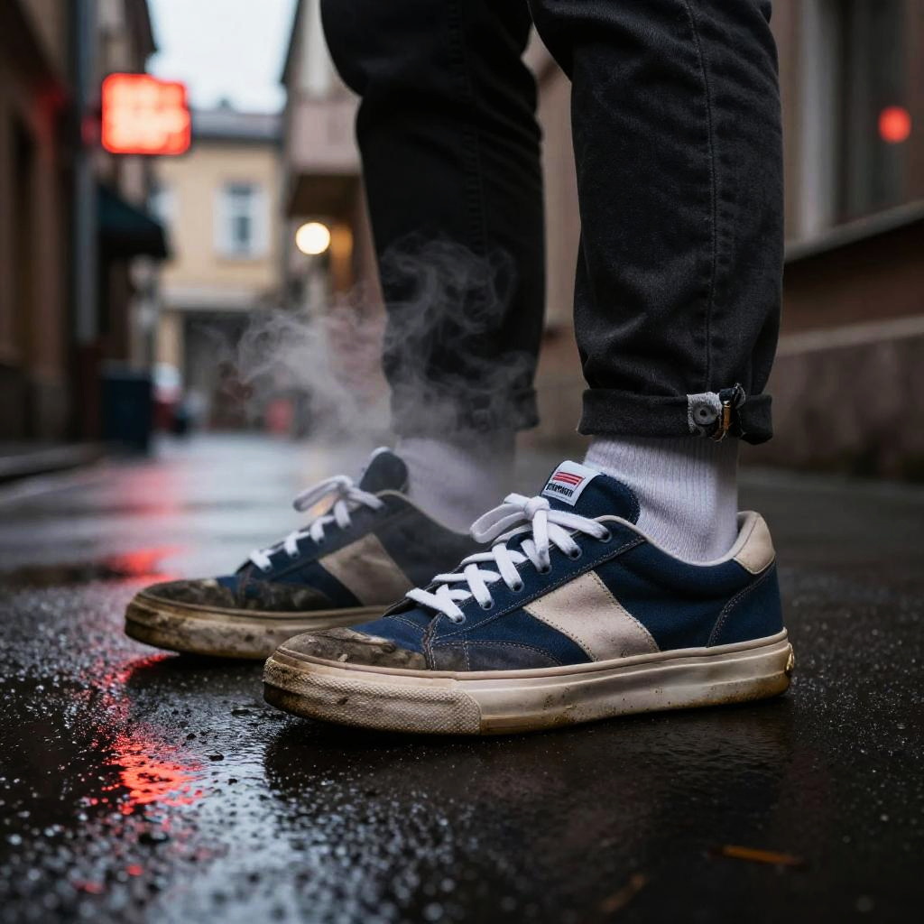 Gopnik shoes featured with streetwear influence in a moody low-light alleyway, steam rising around scuffed trainers, detailed fabric and sole textures emphasized, subtle neon signage reflecting off wet pavement, capturing Eastern European street vibe in twilight.