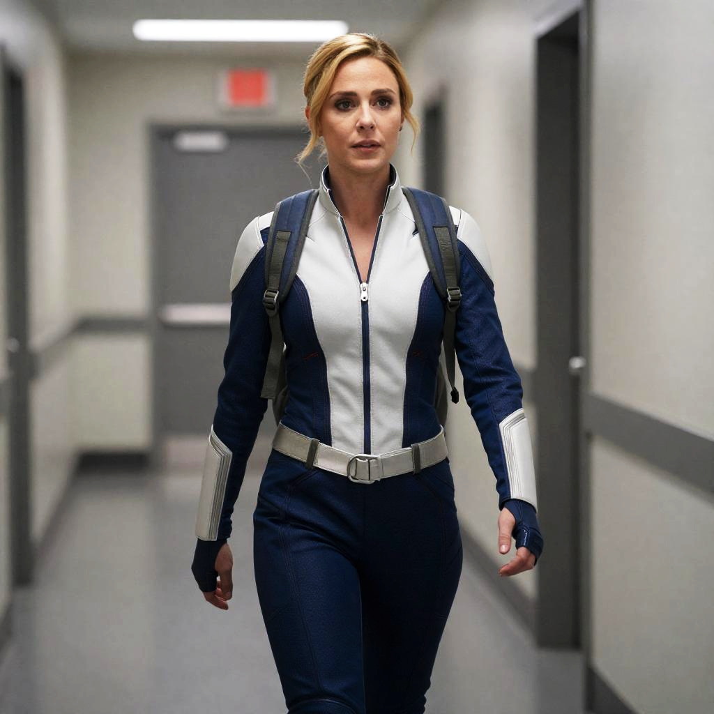 Rescue Pepper Potts Costume, woman with a backpack walking down a hallway