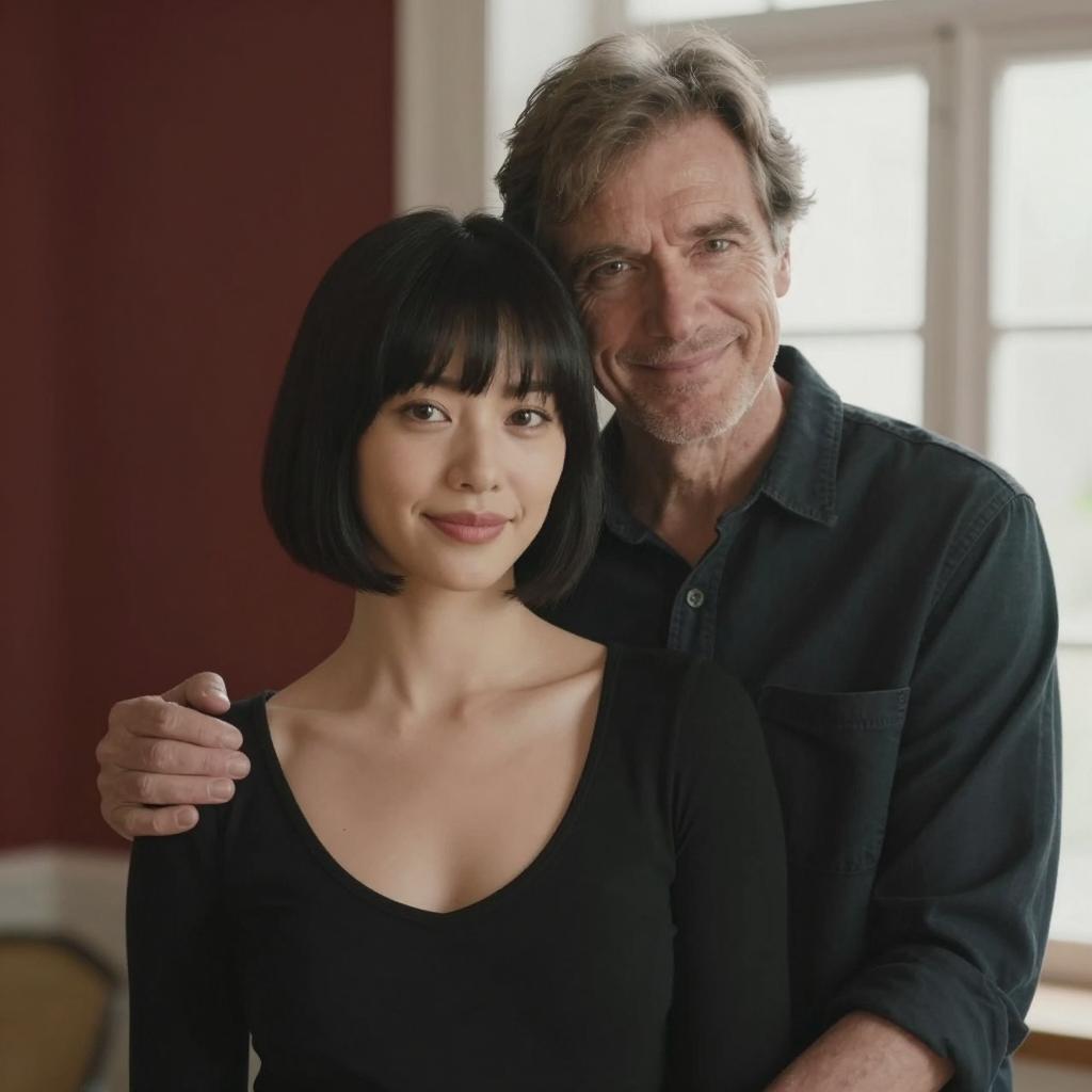 Photograph of a bald, elderly man with a scarred face, wearing a brown coat and red tie, standing behind a woman with short black hair, wearing a spiked helmet and black dress, with eyes closed in distress. Dark, dimly lit room with hanging lights in the background.