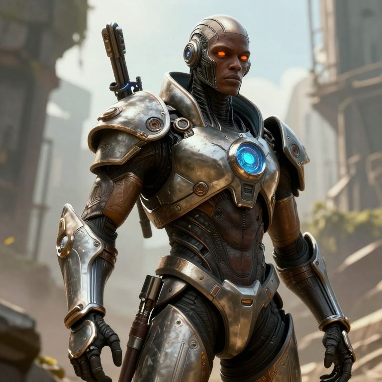 A highly detailed CGI image of a muscular, black-skinned male android with glowing red eyes, standing in a futuristic, ruined cityscape. He wears a sleek, metallic armor with shoulder pads, a glowing blue chest emblem, and a gun holstered on his right shoulder. His armor is polished with intricate, mechanical designs. The background shows blurred, dilapidated buildings with sunlight filtering through. The android's expression is stern, and his overall appearance is futuristic and formidable.