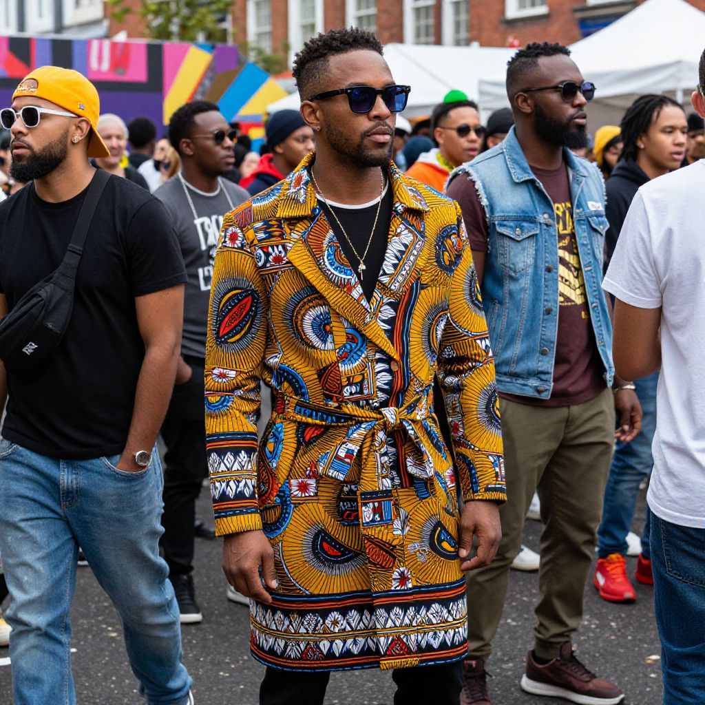 Street fashion for men at a street festival, blending cultural elements with bold cuts—wrap coats, ethnic prints, denim vests, and oversized sunglasses—crowd of diverse individuals, lively music, vibrant colors, energetic and inclusive urban scene
