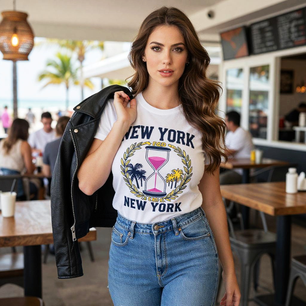 A Hourglass woman in a graphic print T-shirt with 'New York' text, blue skinny jeans, and a black leather jacket draped over her shoulder, exuding natural beauty with long wavy hair, stands at a trendy restaurant in Miami beachside, captured in the visual style of Juan Francisco Casas Ruiz. Sexy. Pretty face and beаutiful eyes. Big breasts