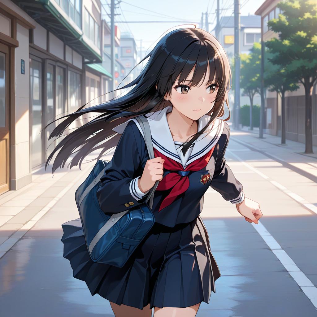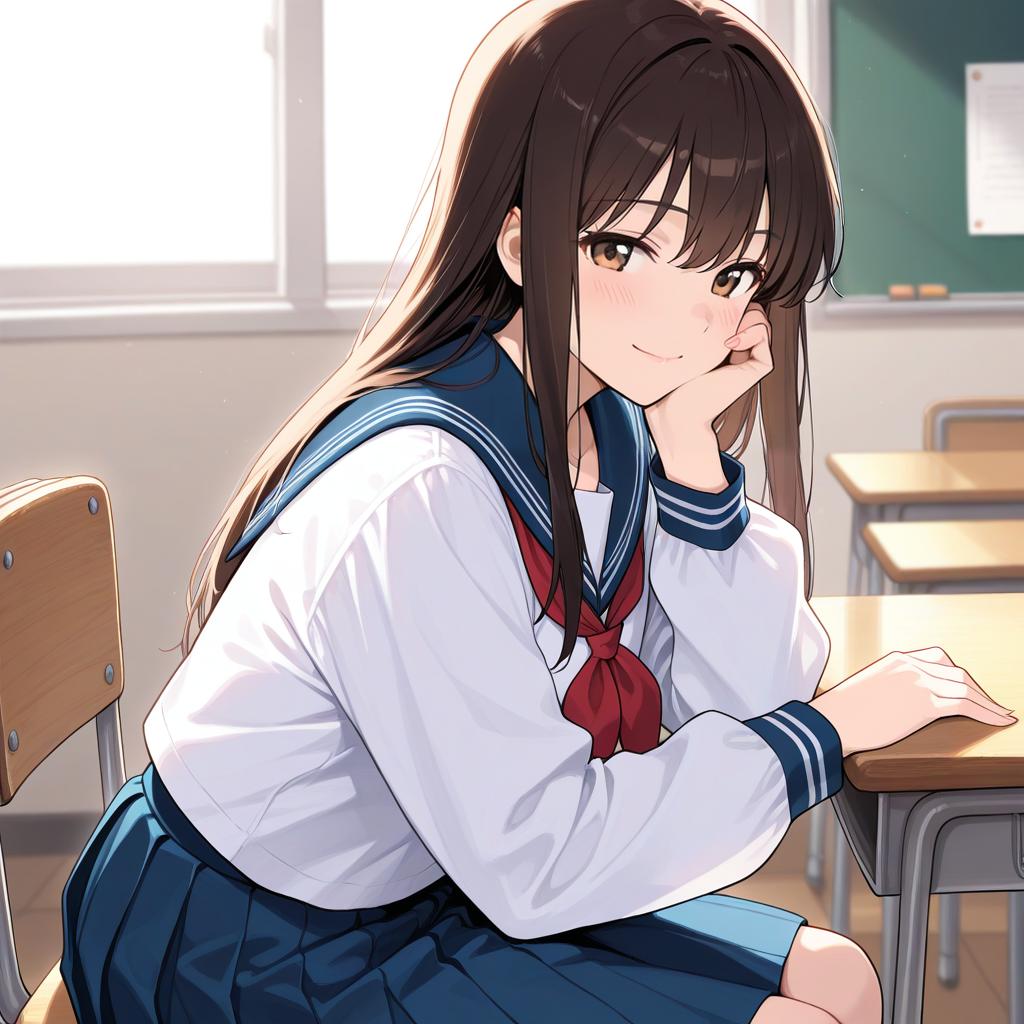 Masterpiece, best quality, highres, 1girl, aatakagi, long hair, sailor collar, red neckerchief, sailor shirt, white shirt, long sleeves, pleated skirt, blue skirt, sitting, chair, classroom, from side, smile, hand on own face