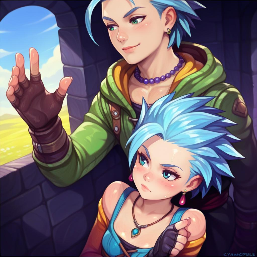 Camus (dq11), dragon quest, 1boy, blue eyes, short hair, spiked hair, blue hair, collarbone, fingerless gloves, long sleeves, earrings, necklace, by artist cyancapsule, illustrious