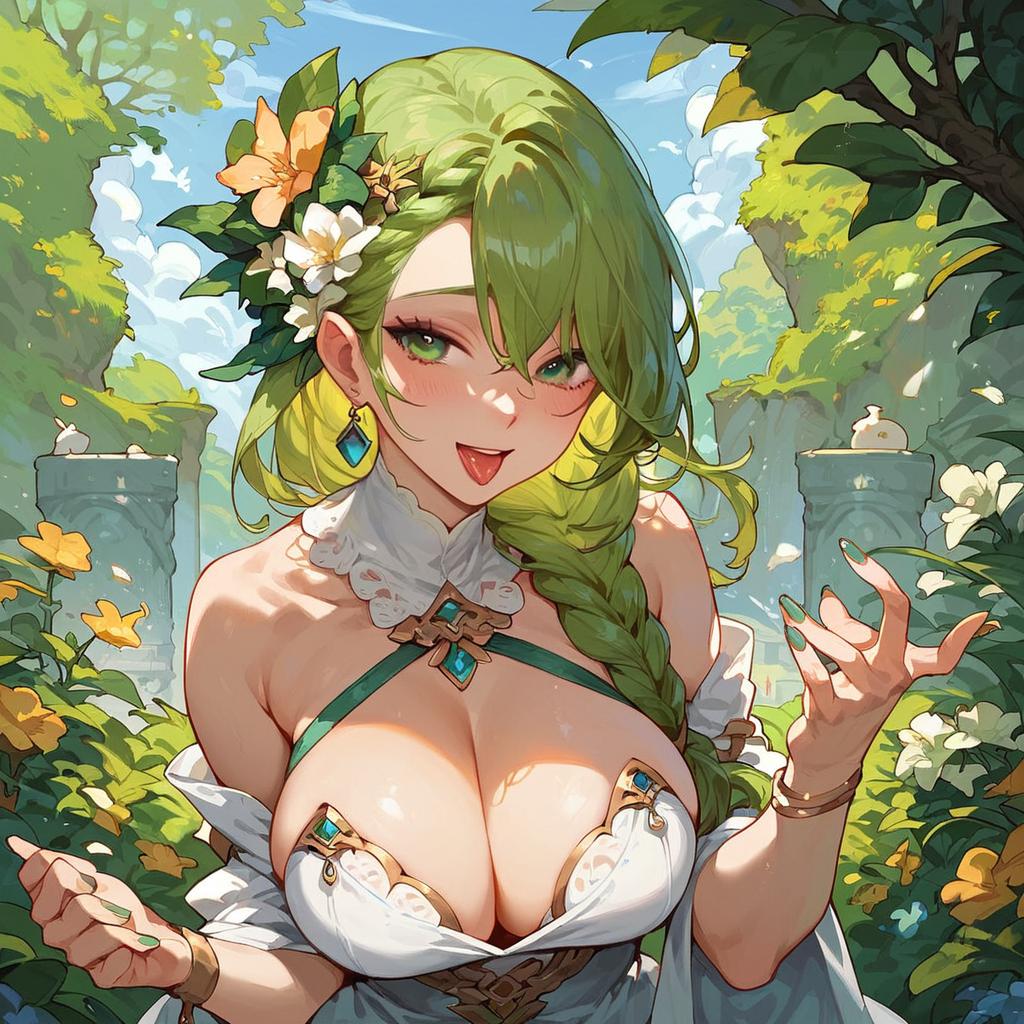 Score_9, score_8_up, score_7_up, source_anime, 1girl, vivianjames, unamused, looking at viewer, holding beer mug, four-leaf clover hair ornament, hairband, formal, green suit, green necktie, green pants, indoors