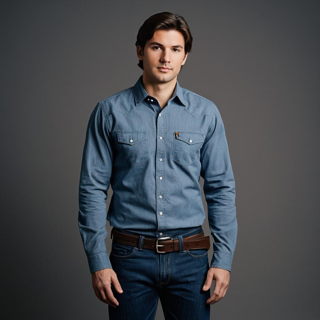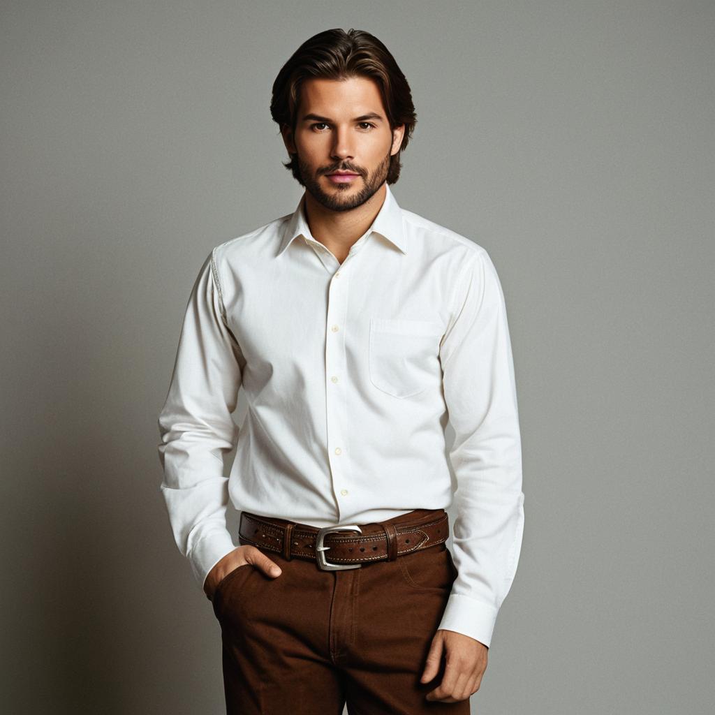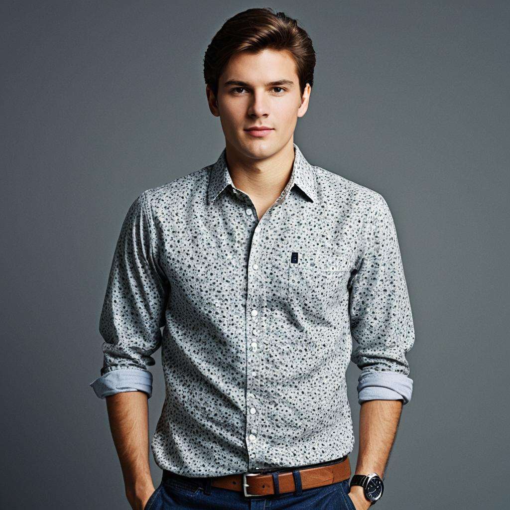 Portrait of a young Caucasian man with brown hair wearing a printed long-sleeve button-up shirt with rolled-up sleeves, dark blue pants, a brown belt, and a black wristwatch. He stands against a plain grey background with hands in pockets, looking directly at the camera with a neutral expression and closed mouth.