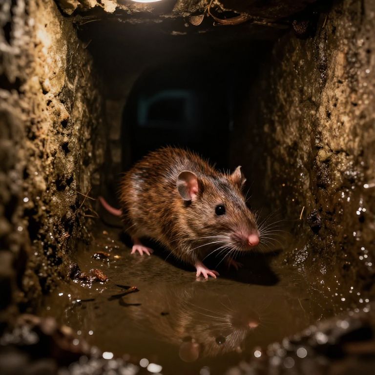 Ratos scurrying through an ancient, dimly lit underground sewer system, detailed textures of wet stone walls, pools of murky water reflecting faint torchlight, eerie and mysterious atmosphere, cinematic lighting