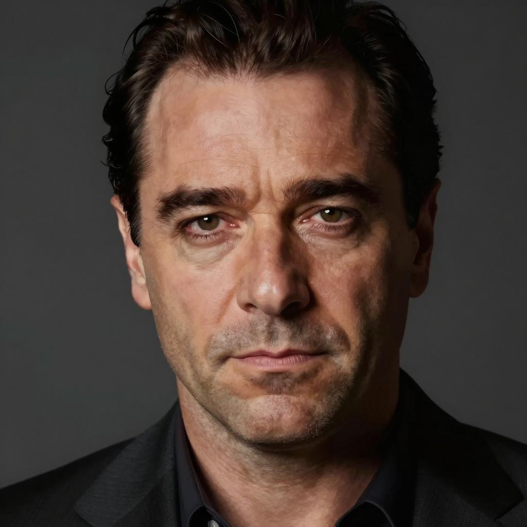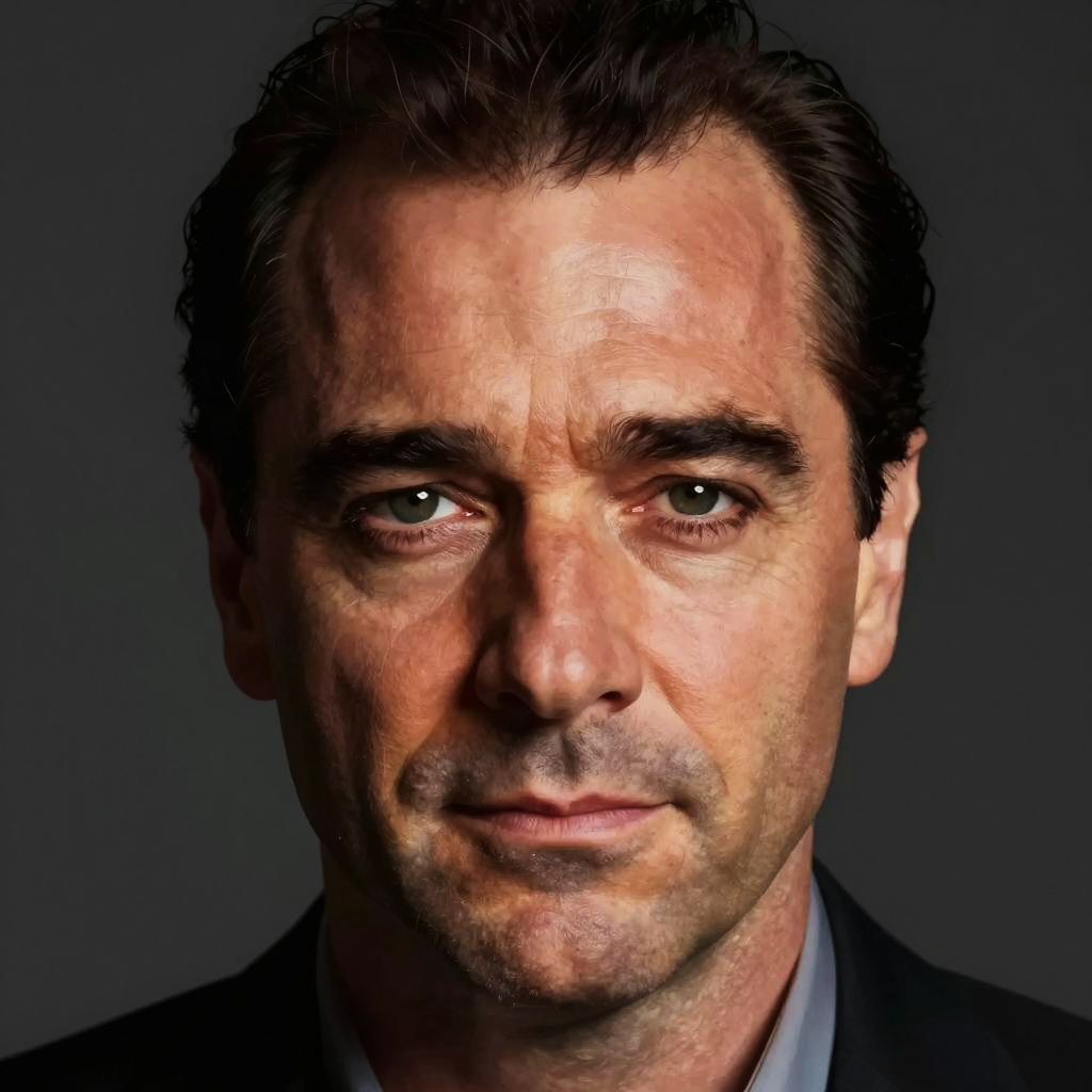 Close-up portrait of a middle-aged man with a focused gaze and a charismatic aura. The image conveys intensity through dramatic lighting and a dark background, reminiscent of themes found in popular crime drama artwork. The subject has short dark hair, brown eyes, and is dressed in a dark suit jacket and shirt.