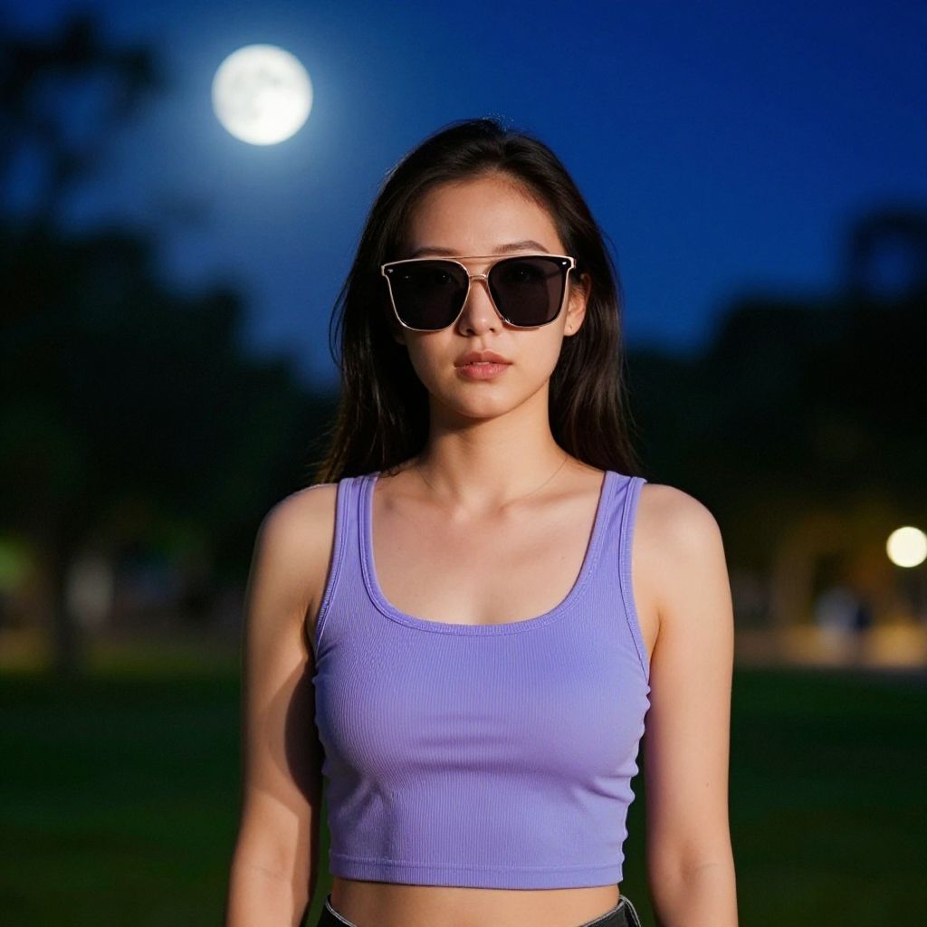 Woman, breasts, facing viewer, fcPortrait, from_above, crop top, detailed face, bodycon tank top, hair, park, sky, trees, moonlight, stars, 1girl, statement sunglasses, petite, vivid colors, bokeh background, subject for emphasis, dramatic colors