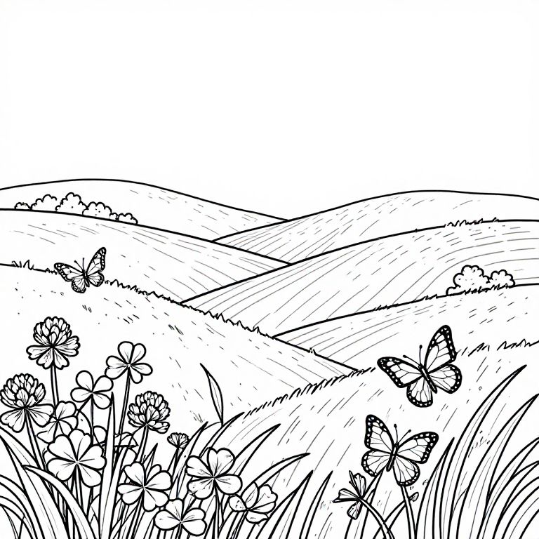 Meadow coloring pages depicting a serene nature scene with rolling hills, butterflies landing on clover patches, and delicate grass blades swaying, created with clean lines and detailed elements for complex coloring fun.