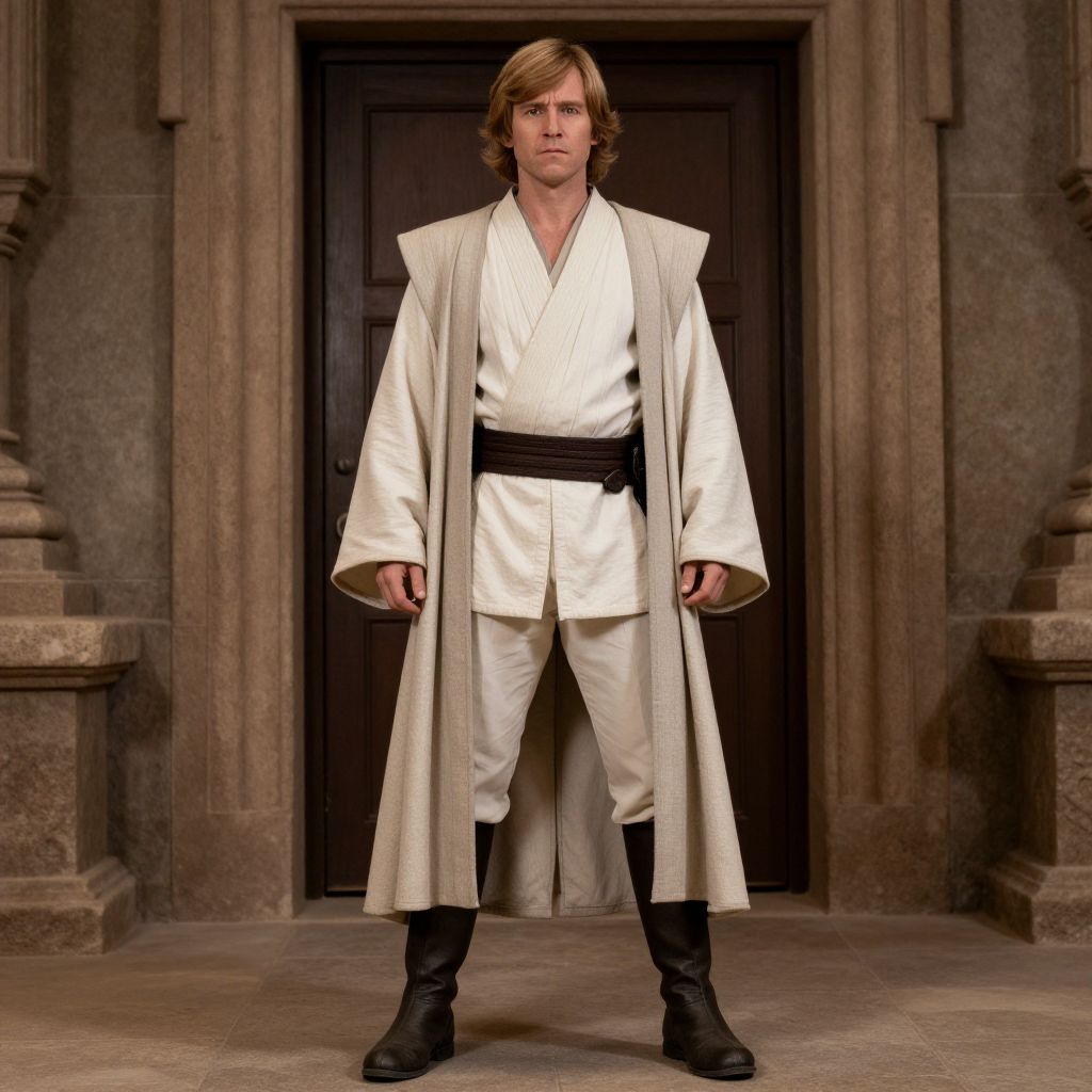Luke Jedi Costume, man in a robe and boots standing in front of a door