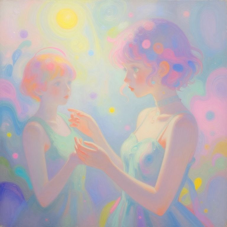 This digital painting in a soft, pastel style features two young women with delicate, ethereal appearances. They face each other, hands gently touching, bathed in a radiant, glowing light with hues of pink, blue, and yellow. Both have short, colorful hair in shades of pink and purple. They wear sleeveless, translucent dresses that blend with the dreamy background. The background is filled with soft, blurry orbs of light and abstract shapes, creating a whimsical, almost magical atmosphere. The light source appears to be above and behind them, casting a gentle glow on their faces and dresses.