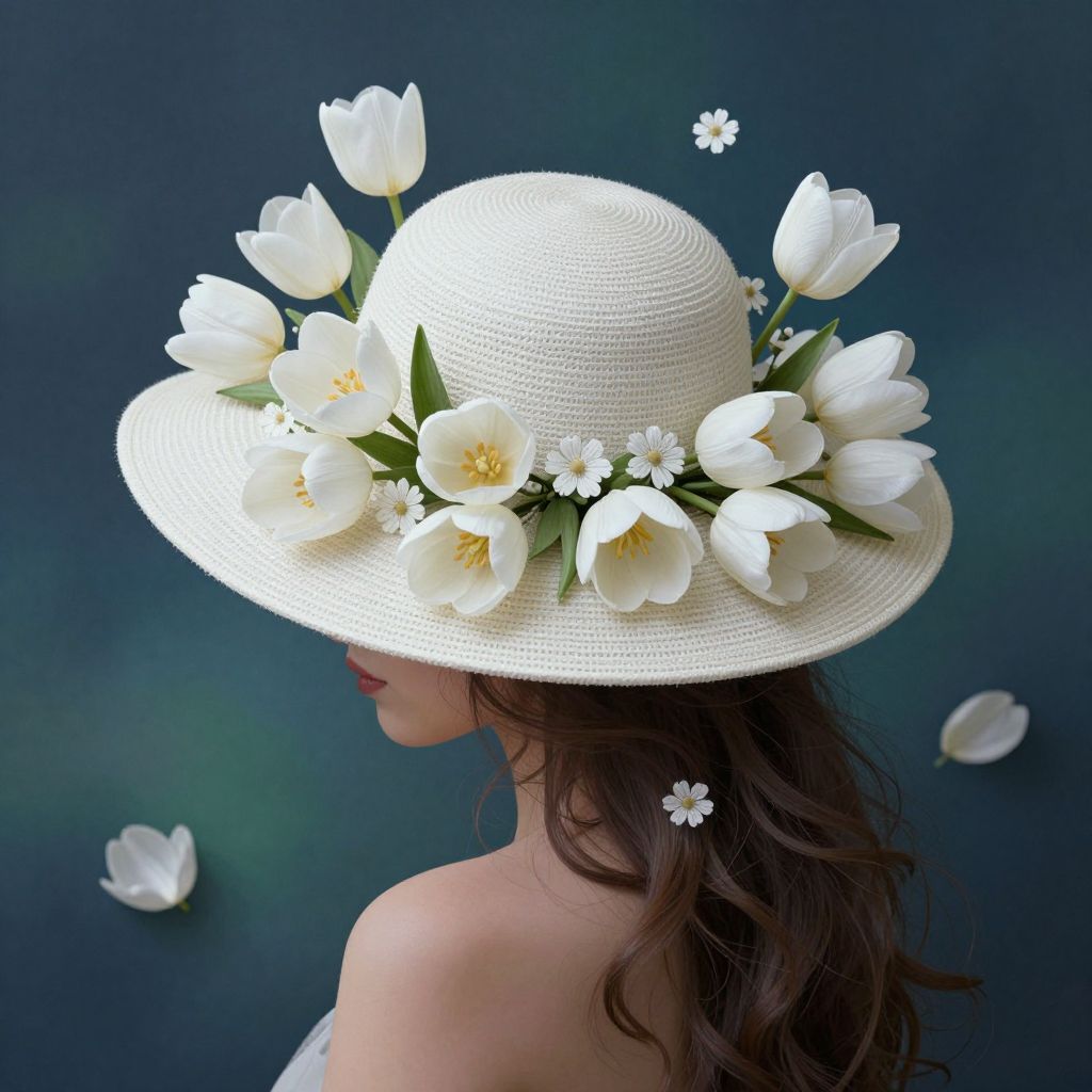 The image depicts a woman adorned with a large, intricately designed hat that is adorned with white tulips and delicate flowers. The hat, which is the central focus, is crafted from a textured material that gives it a three-dimensional appearance. The flowers, both on the hat and scattered around, are rendered with a high level of detail, showcasing their petals and stamens in a realistic manner. The background is a gradient of dark blues and greens, creating a serene and somewhat ethereal atmosphere. The woman's hair, which is long and flowing, is partially obscured by the hat, adding a sense of mystery to the composition. The overall scene is harmonious, with the hat and flowers complementing each other and the background, creating a balanced and visually appealing image.