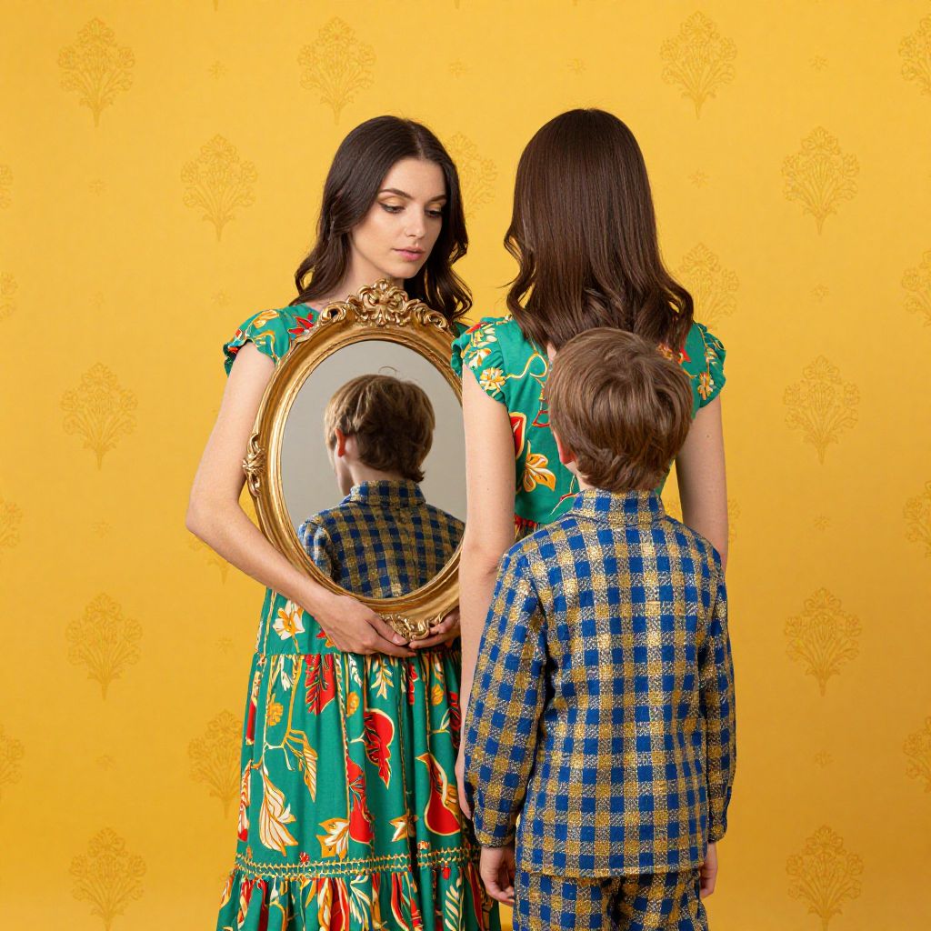 Two figures stand side by side against a vibrant yellow background adorned with repeating floral patterns, as a woman in a colorful green dress holds a golden-framed mirror, reflecting the back of a child dressed in a blue and gold checkered outfit.