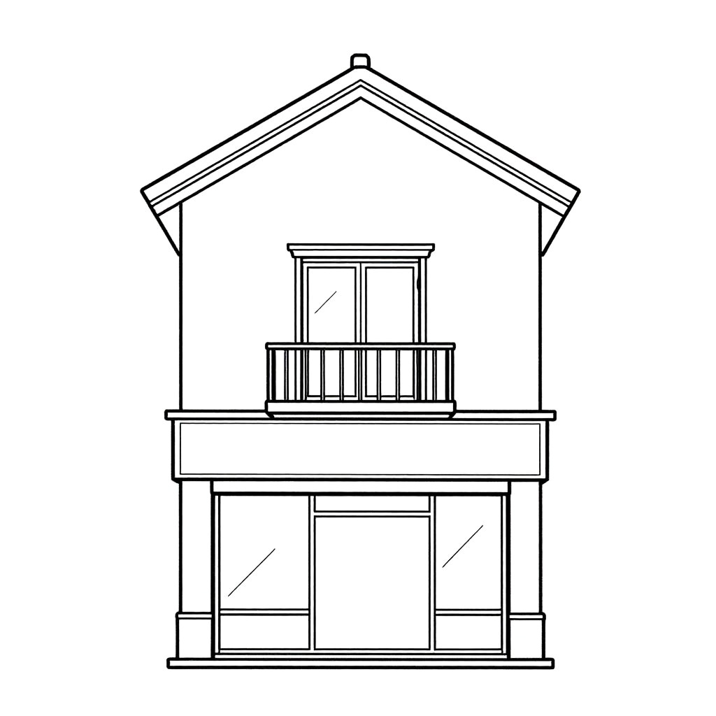 This is a black-and-white digital line drawing of a two-story building. The ground floor has a shop with a sign and large window, while the upper floor features a single window and a small balcony. The building's roof is simple with a central peak. The drawing has a clean, minimalist style with fine, precise lines.