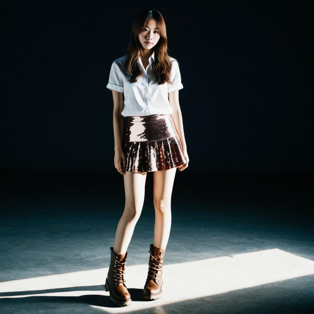 Full-body portrait of a young Asian woman with long brown hair standing in a spotlight against a dark background. She is wearing a white short-sleeve button-up shirt tucked into a brown sparkly mini skirt, paired with brown lace-up ankle boots. The image has a moody, studio-lit atmosphere with visible shadow on the floor.
