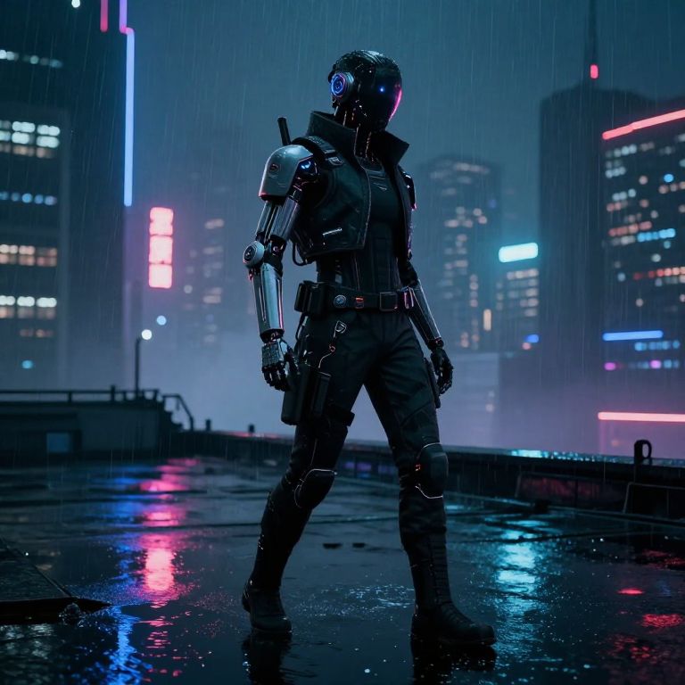 Cyberpunk soldier in dark armor stands in rain-soaked neon-lit city street, holding gun, surrounded by glowing billboards, futuristic drones.