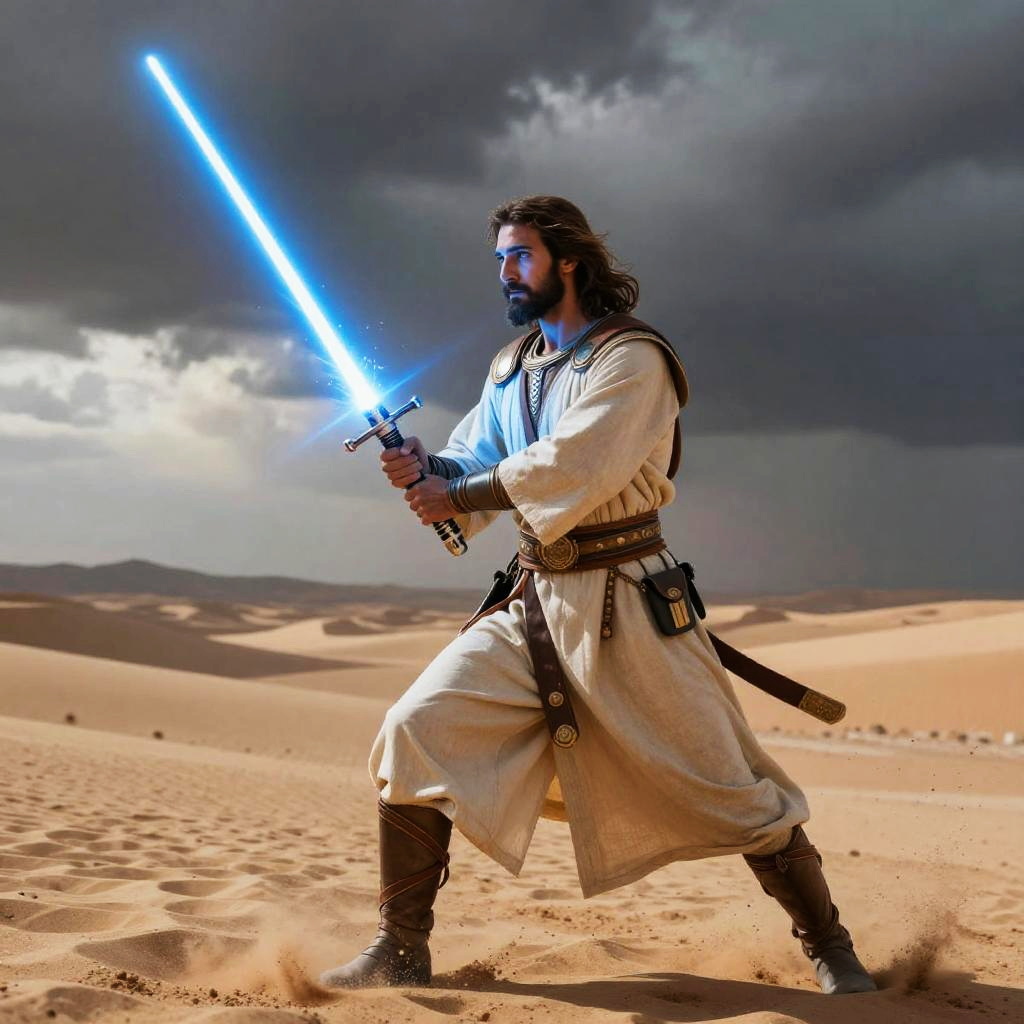 Jesus wielding a vibrant blue lightsaber in a futuristic desert landscape, combining traditional religious attire with sci-fi armor details, intense light reflections on sand, stormy sky background, dynamic action pose with spiritual intensity.