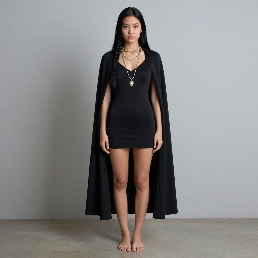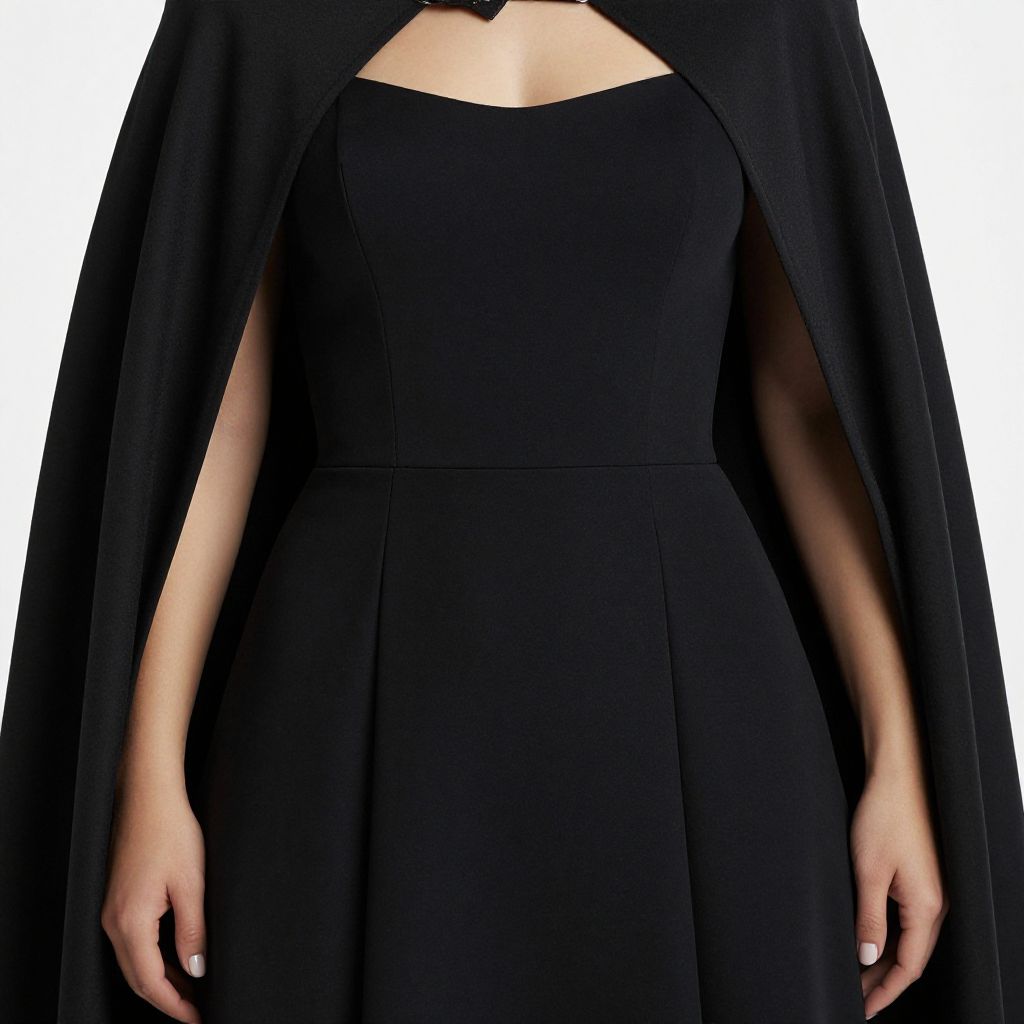 Photograph of a woman wearing a black, sleeveless dress with a square neckline and a flowing black cape, arms relaxed at sides.