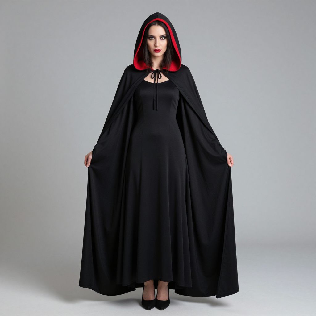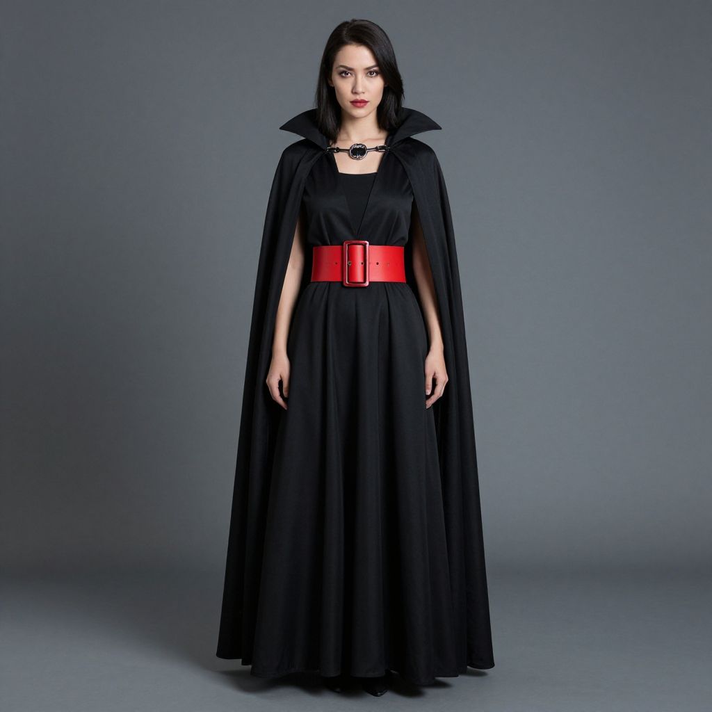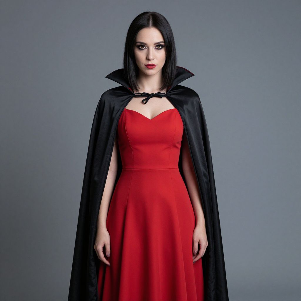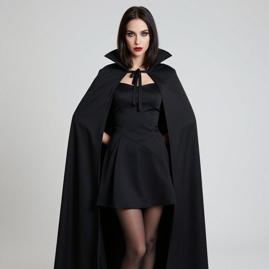 "Vampire Dress, a close up of a woman in a black dress and a black cape"