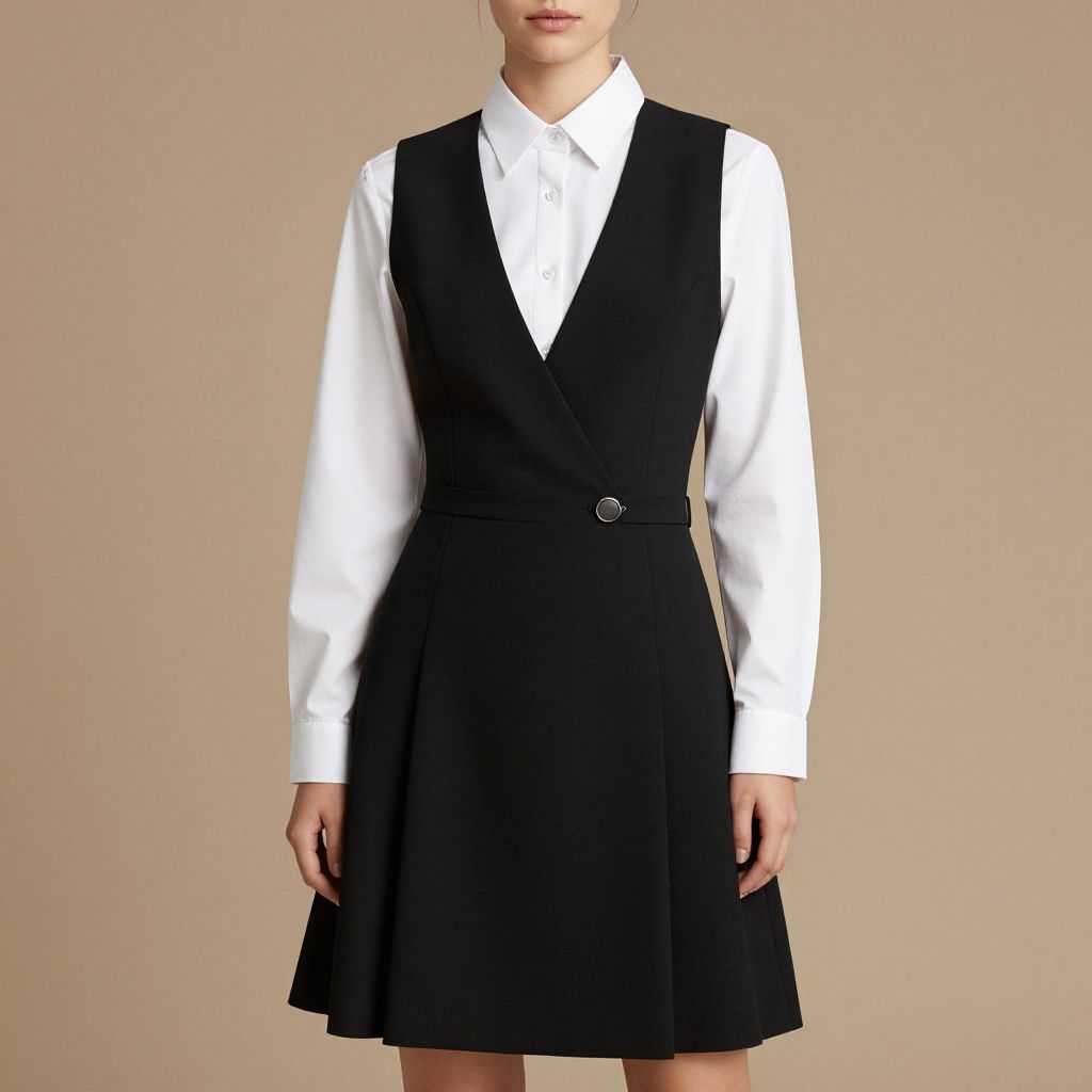 Photograph of a person from the neck to the hips, wearing a black, sleeveless, square-neck dress with a fitted bodice and a flared skirt. Over the dress, they have a black cape with a high collar that has a cutout at the neckline, revealing a small portion of their chest. The person's arms are hanging down, and their skin tone is light. The background is plain white, making the black clothing stand out. The texture of the dress and cape appears smooth and slightly glossy.