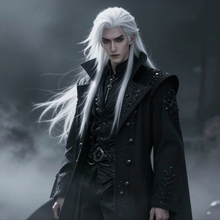 A mysterious, handsome vampire with long white hair stands in a foggy, dark misty background, wearing a black coat with intricate designs, in a Krenz Cushart style, reminiscent of anime or manga.